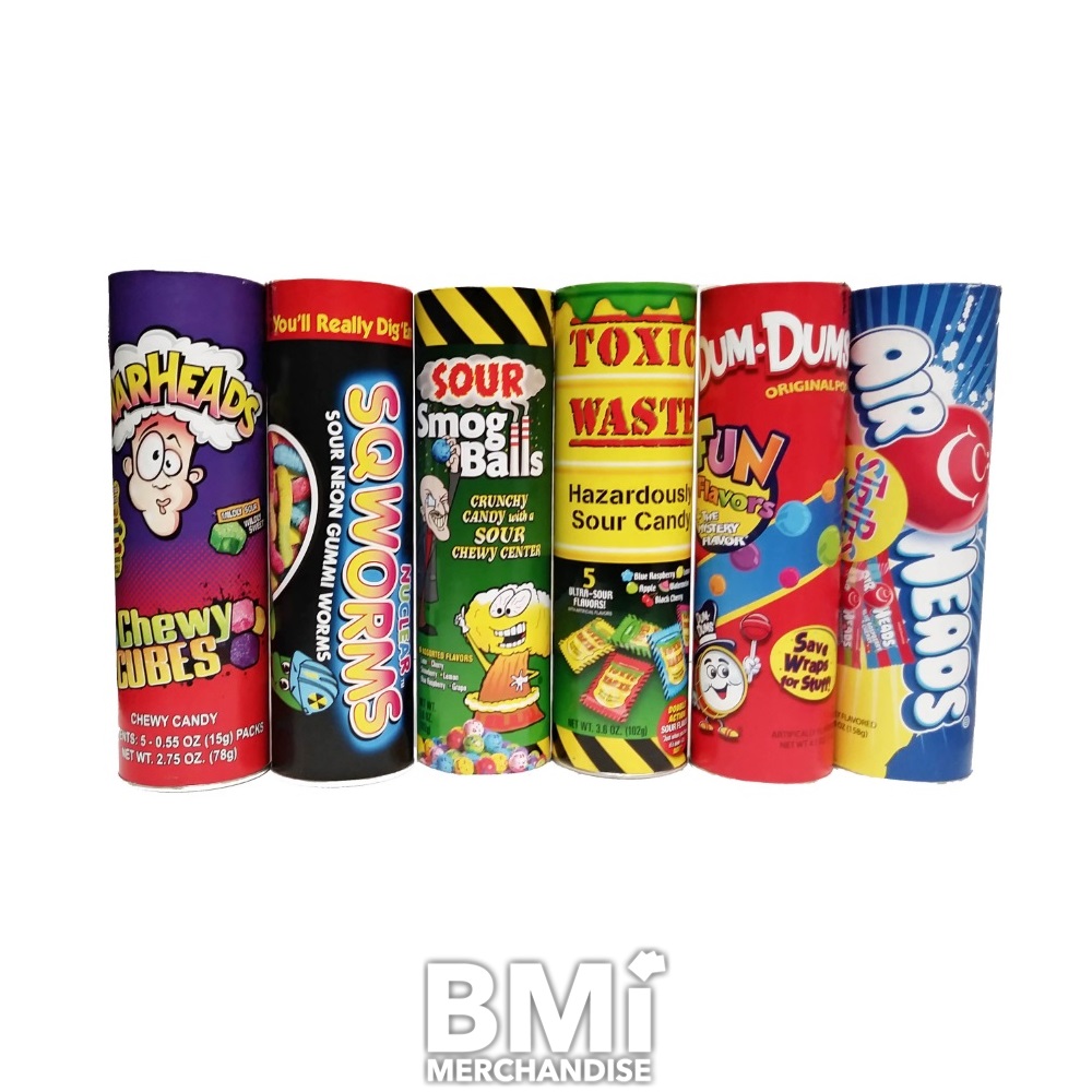 9INCH LICENSED CANDY BANKS. GREAT CANDY VALUE FOR YOUR CENTER! INCLUDES AIRHEADS, DUM DUMS, WARHEADS, AND MORE. EACH CANDY TUBE CONTAINS 2.75OZ - 5.5OZ OF CANDY, AND WHEN FINISHED, CAN BE USED AS A BANK TO STORE COINS.