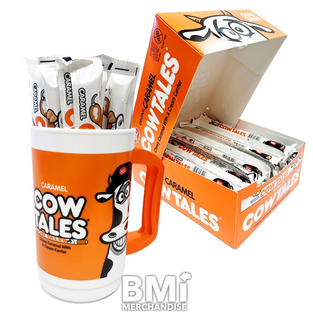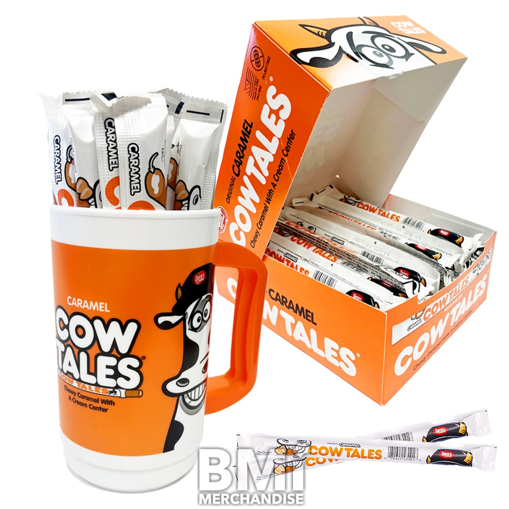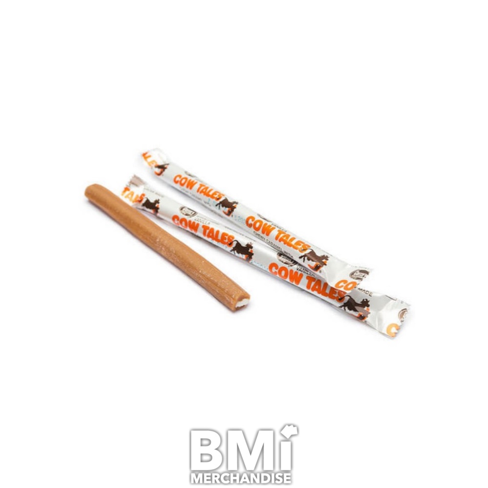 COW TALES VANILLA CANDY. CHEWY CANDY WITH SMOOTH CRÈME FILLING. EACH 1 -OZ PC WRAPPED IN 100 PC DISPLAY BOX.