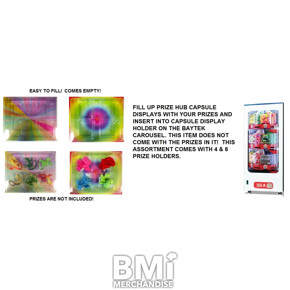 PRIZE HUB CAPSULE DISPLAY UNITS- COME EMPTY! YOU FILL THEM WITH THE PRIZES~ SO EASY TO DO! PERFECT FIT TO DISPLAY YOUR CAPSULE PRIZES FOR THE BAY TECH SYSTEM! JUST SLIDE OUT THE BACK PANEL, REMOVE THE CLEAR PLASTIC INSERT, PLACE PRIZES IN EACH SECTION AND REFIT THE LINER. SLIDE IN THE BACK PANEL AND THEN INSERT INTO CAPSULE DISPLAY HOLDER OF THE BAY TECH CAPSULE CAROUSEL. THIS COMES WITH SIX 4 PIECE PRIZE HOLDERS, AND SIX 6 PIECE PRIZE HOLDERS. PLEASE NOTE, THE ACTUAL PRIZES ARE NOT INCLUDED!