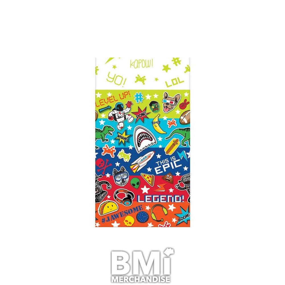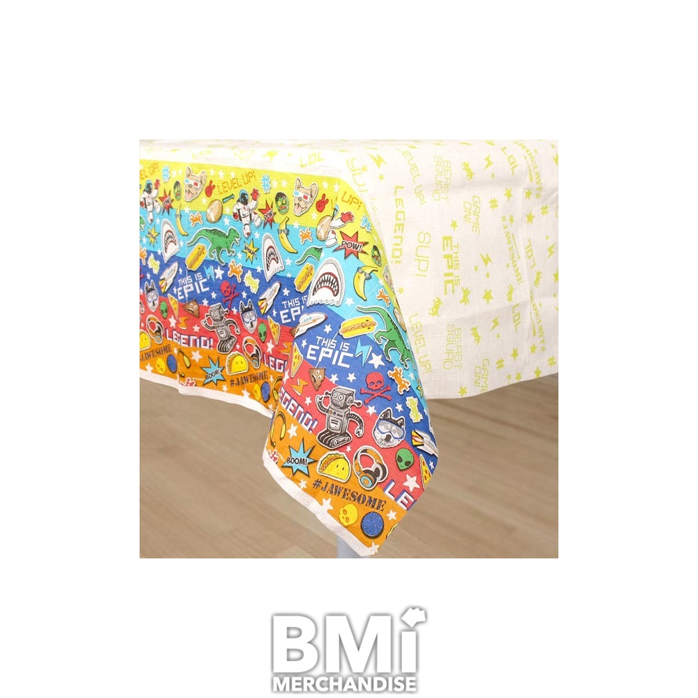 EPIC PARTY TABLE COVER. LOTS OF COLORS AND EMOJIS MAKE ANY TABLE HAVE THAT EPIC LOOK! COVER MEASURES 54 X 96. DISPOSABLE ONE TIME USE!