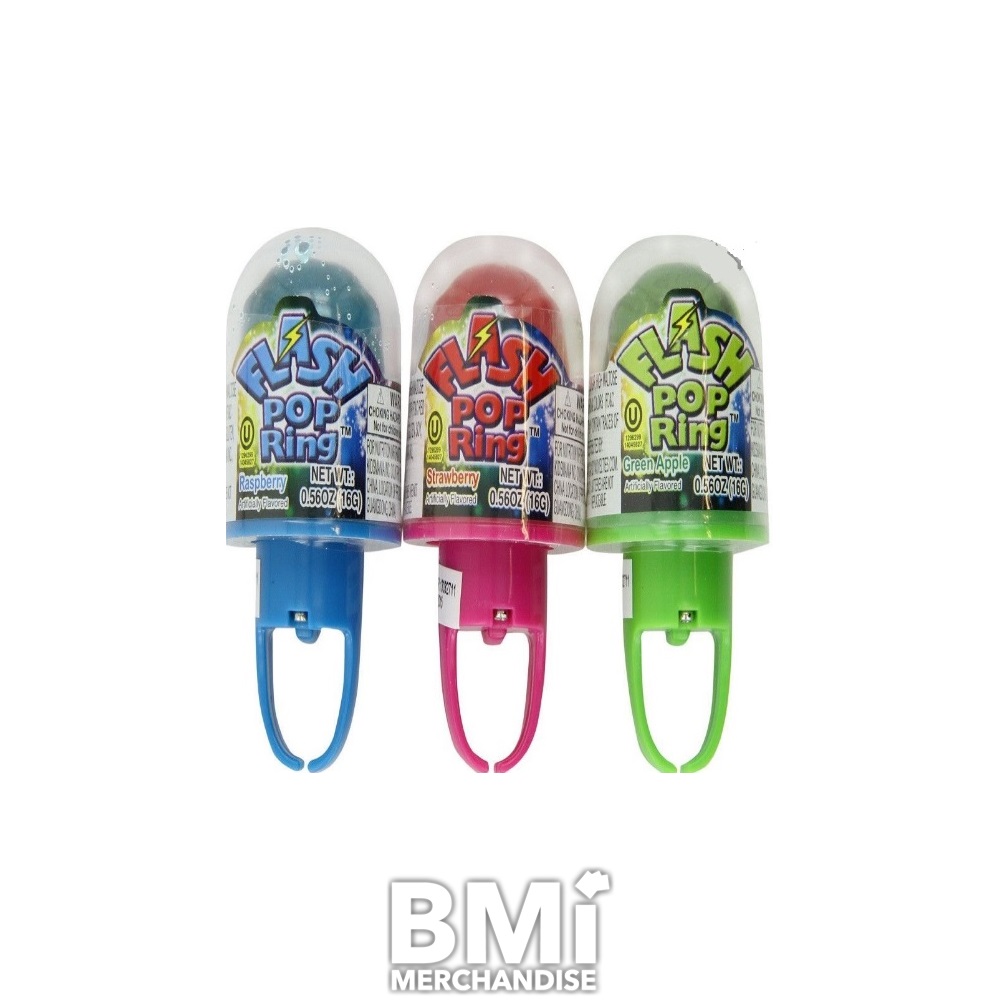 FLASH POP RING. SUPER TASTY AND SUPER FUN, THE LED LIGHT UP FLASH POP RING COMES IN ASSORTED FLAVORS AND COLORS. EACH RING WRAPPED IN A 24PC DISPLAY BOX.