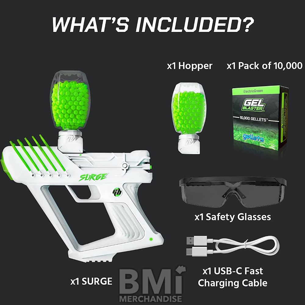 GEL BLASTER SURGE: INCLUDES 1 SURGE, 1 HOPPER, 1 PACK OF 10,000 GELS, 1 PAIR OF SAFETY GLASSES, AND 1 USB-FAST CHARGING CABLE!