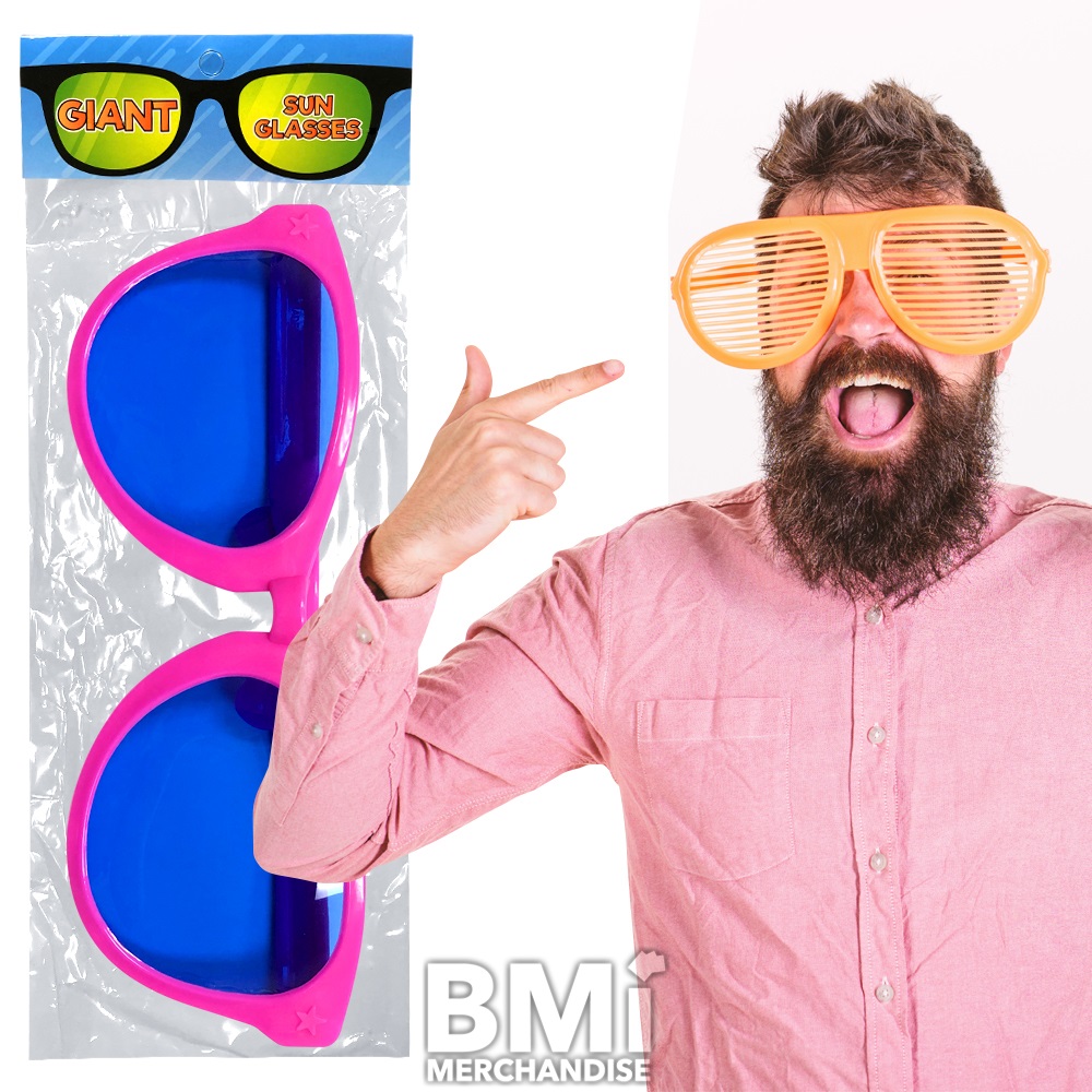 GIANT SUNGLASSES. THESE GIANT TRENDY SUNGLASSES ARE SURE TO GET A LAUGH, AND KEEP YOU LOOKING ON THE BRIGHT SIDE OF LIFE. ASSORTED NEON COLORS, GREEN, ORANGE, PURPLE, AND PINK.