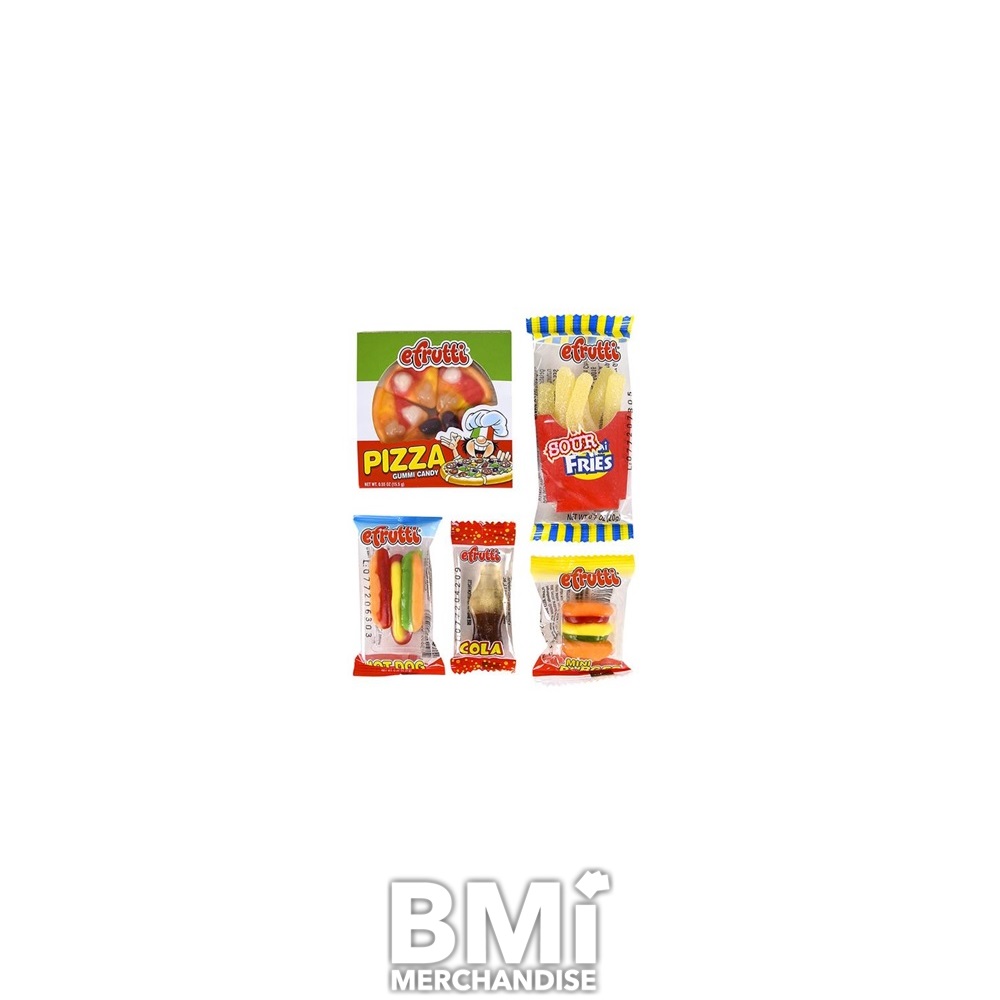 GUMMI LUNCH BAG. GUMMI CANDY ASSORTMENT. 2.7 OZ BAG INCLUDES INDIVIDUALLY PACKAGED PIZZA, SOUR FRIES, COLA, HOT DOG AND HAMBURGER GUMMY CANDY. AVAILABLE IN REGULAR OR SOUR FLAVORS. COMES PACKAGED 12 BAGS TO A DISPLAY BOX. CAN ALSO PEG.
