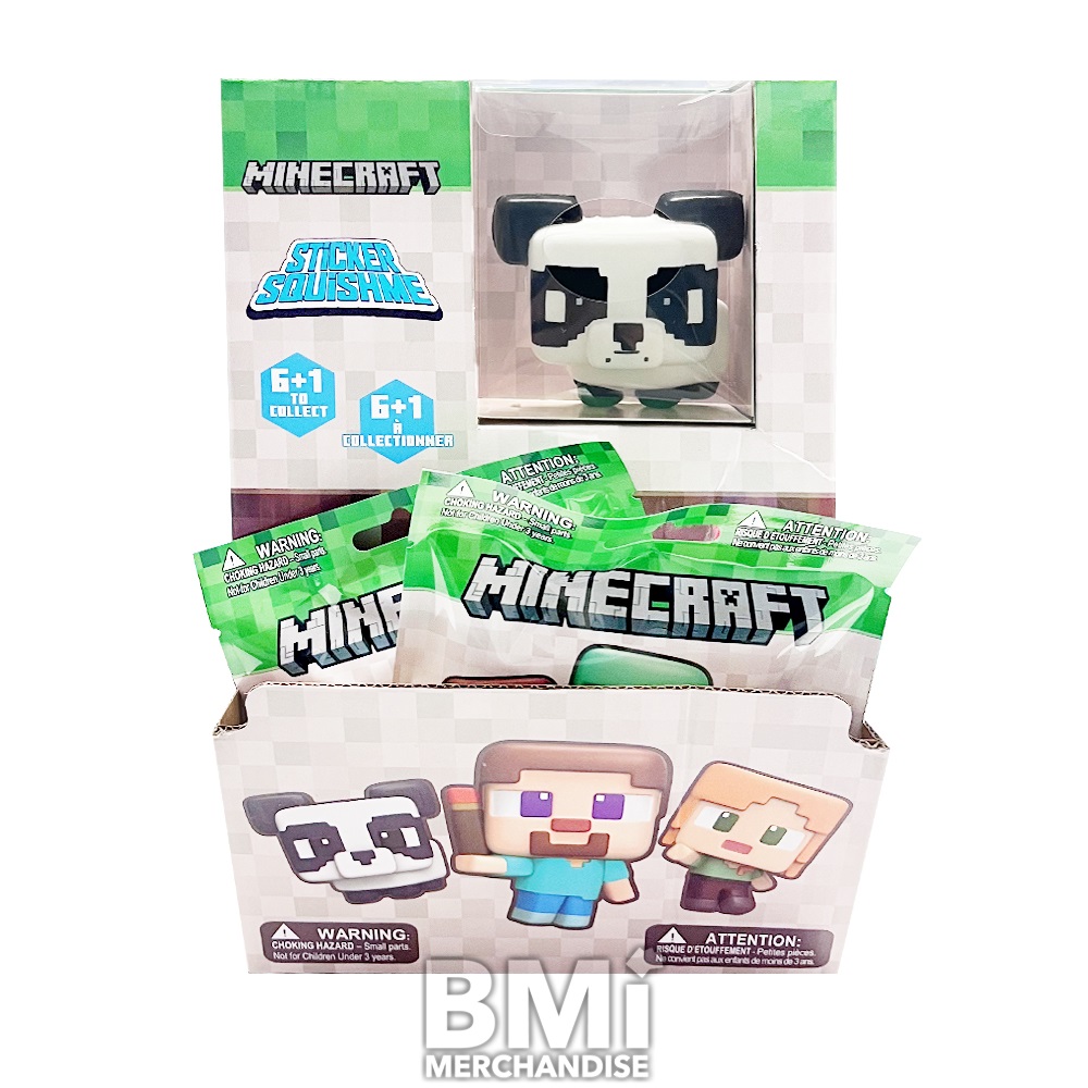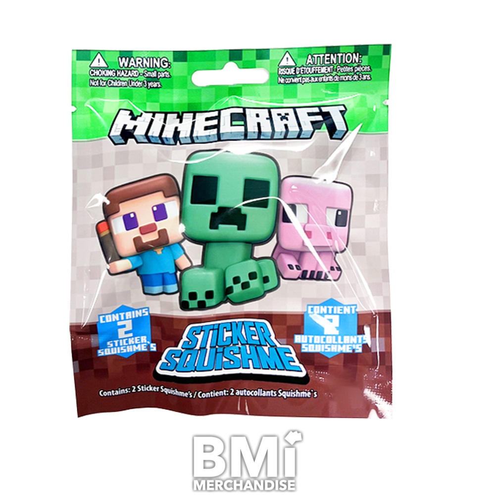 MINECRAFT SQUISHME FIGURE IN BLIND BAG. OFFICIALLY LICENSED. EACH BLIND BAG CONTAINS A SLO-RISE FOAM STICKER TO COLLECT, DISPLAY, OR SQUEEZE TO RELIEVE STRESS. GREAT FOR BOTH ADULTS AND KIDS.