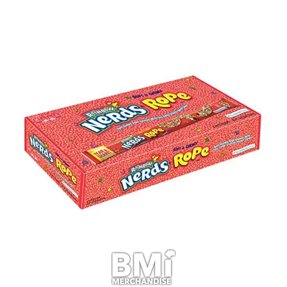NERDS ROPE RAINBOW CANDY. YUMMY FUN IN A SOFT, CHEWY CENTER COATED WITH TINY, TANGY CONFETTI COLORED NERDS. COMES AS A 13 INCH LONG TUBE IN A 24 PIECE COUNTER TOP DISPLAY.