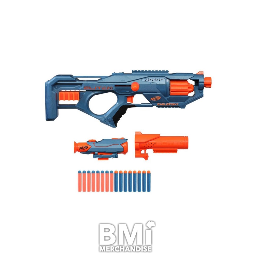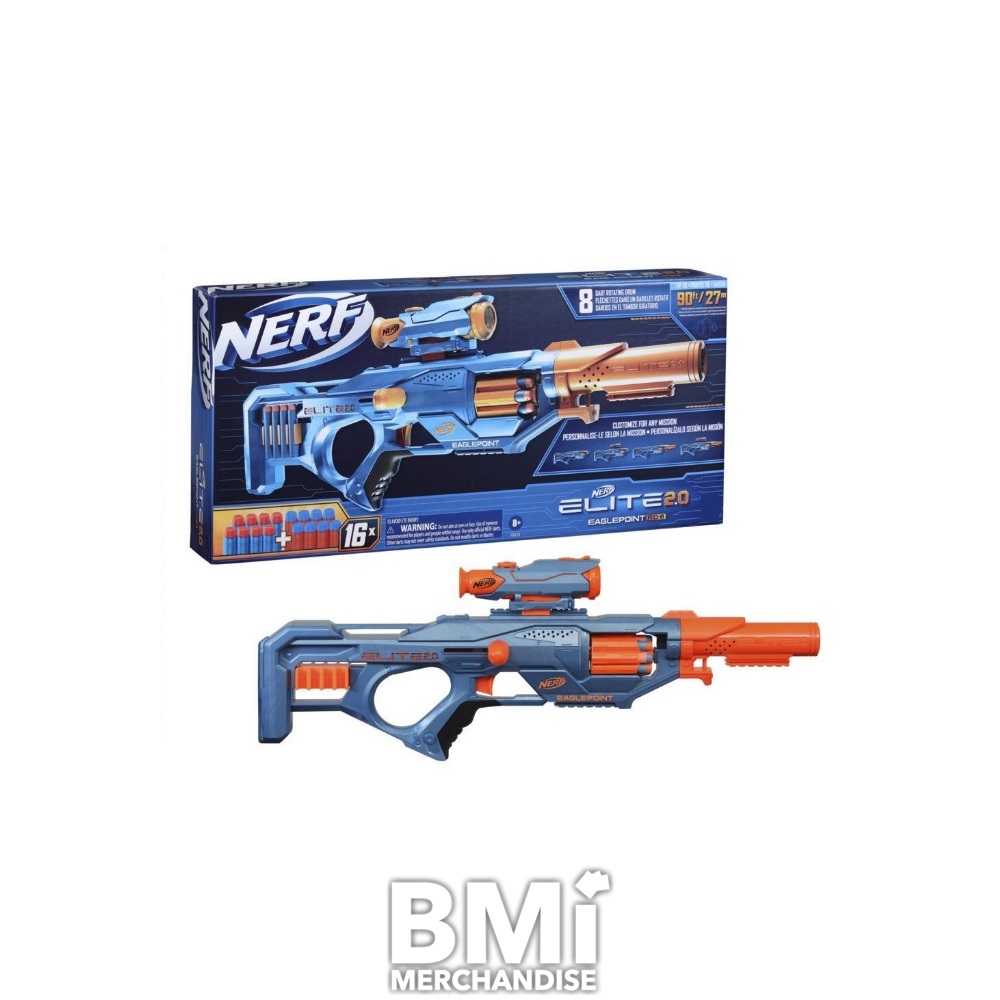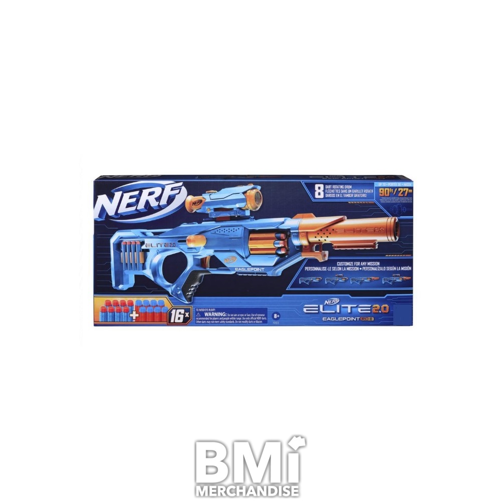 NERF ELITE 2.0 EAGLEPOINT RD-8 BLASTER. INCLUDES A DETACHABLE SCOPE AND BARREL TO CUSTOMIZE FOR DIFFERENT BLASTER MISSIONS. FIRE 8 DARTS IN A ROW UP TO 90 FEET FROM THE REVOLVING DRUM THAT HAS BOLT ACTION PRIMING. INCLUDES BLASTER, 16 NERF ELITE DARTS, DART STORAGE. (TACTICAL RAILS SOLD SEPARATELY)