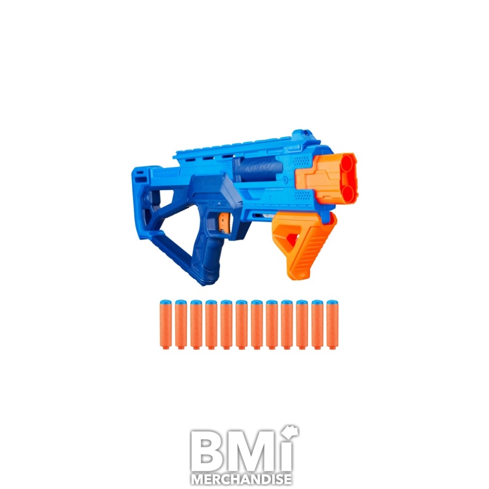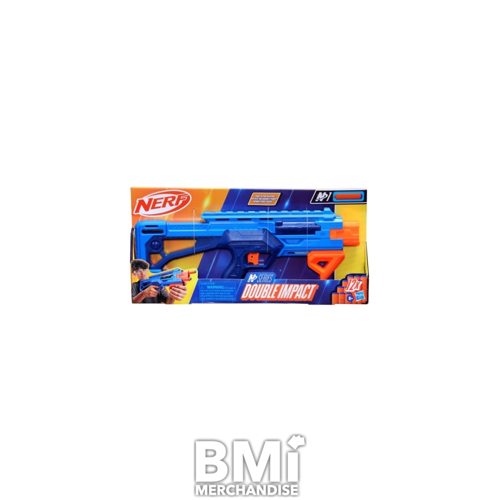 NERF N SERIES DOUBLE IMPACT BLASTER. FEATURES PUMP ACTION BLASTING.INCLUDES 12-NERF N1 DARTS. RECOMMENDED AGES 8 AND OVER.