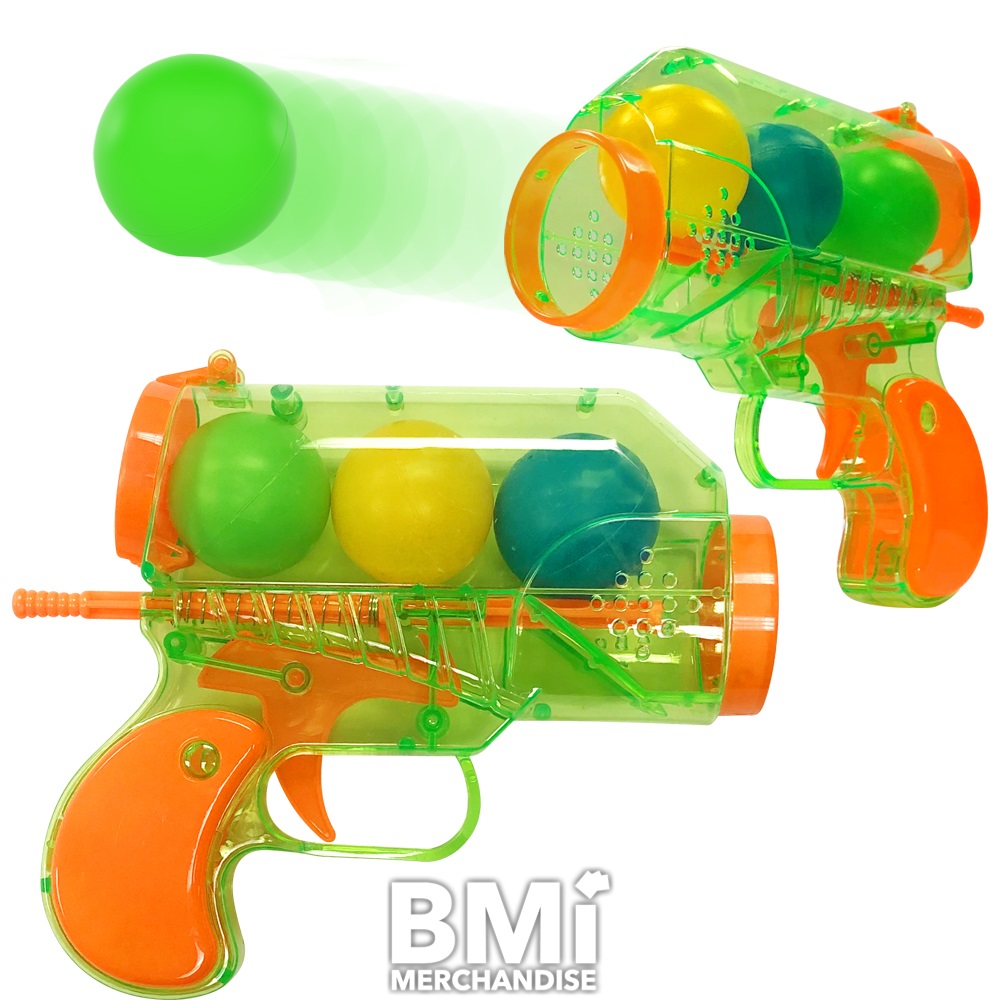 THE POP-A-BALL SEE THRU GUN SHOOTS THREE SAFE BALLS! INCLUDES THREE COLORED BALLS: ORANGE, YELLOW, AND BLUE. COMES IN ASSORTED HANDLE COLORS. WATCH THE SHOOTING ACTION TAKE PLACE WITH THIS GUN'S SEE THRU BODY! GREAT PEGABLE ITEM!