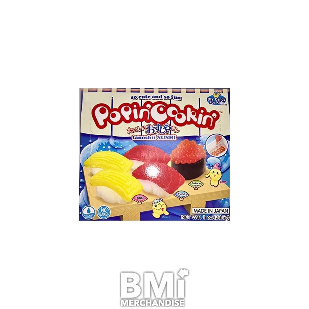 POPIN COOKIN SUSHI DIY CANDY KIT. EVERYONE CAN NOW ENJOY SUSHI WITH THIS VERY POPULAR DIY CANDY KIT FROM JAPAN. THE RICE IS A GRAPE FLAVORED CANDY AND THE TOPPINGS ARE AN ASST. OF SWEET, FRUITY FLAVORS. YOU GET EVERYTHING YOU NEED TO MAKE TUNA, SWEET EGG, AND SALMON ROE. JUST ADD WATER TO THE INCLUDED INGREDIENTS AND YOU'RE ALL SET. NO BAKING NEEDED.