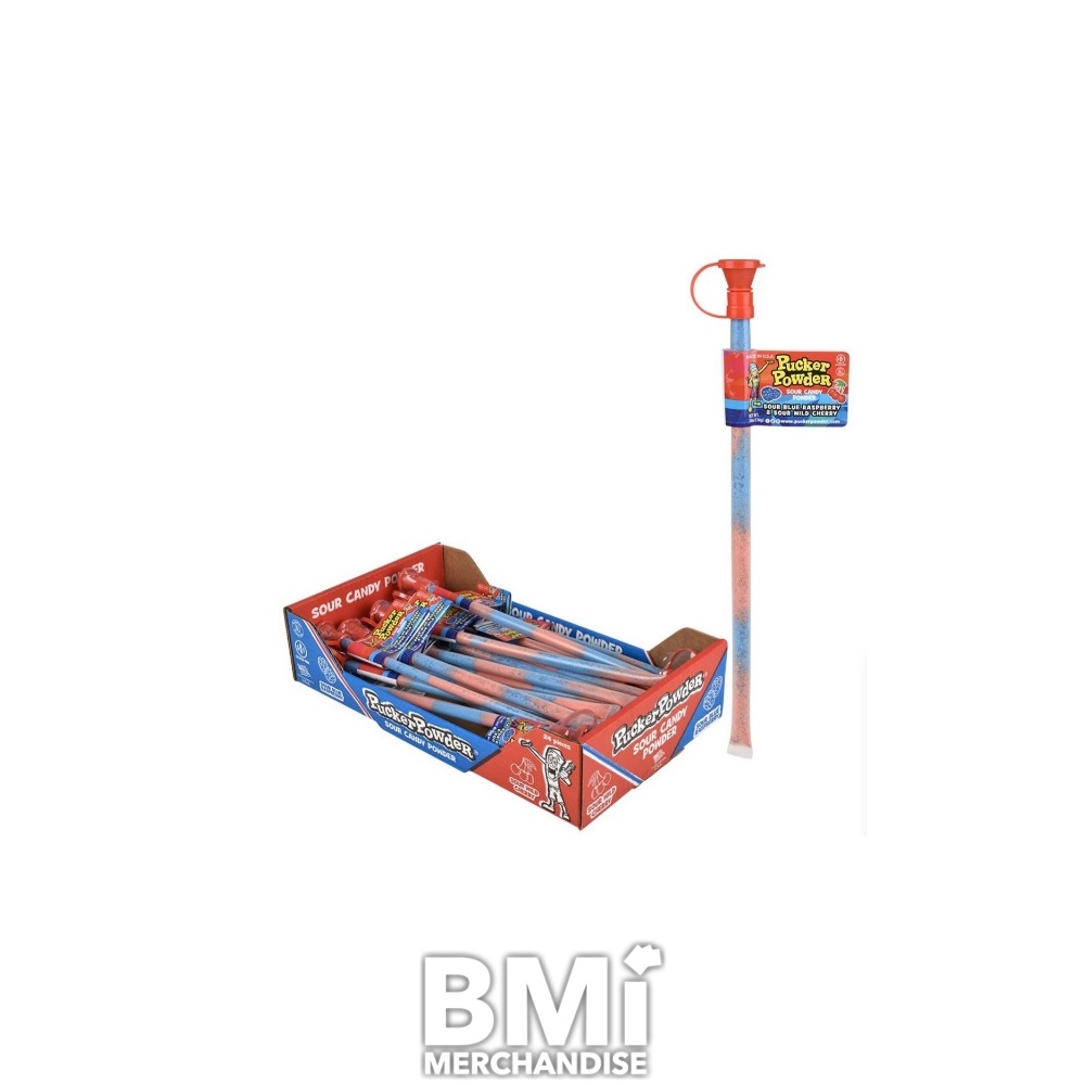 PUCKER POWDER 12INCH TUBE-24CT. ENJOY A BURST OF TANGY SWEETNESS WITH THESE SINGLE SOUR CANDY POWDER TUBES IN SOUR BLUE RAPBERRY AND SOUR WILD CHERRY FLAVORS. PACKAGED IN A 24PC DISPLAY BOX.