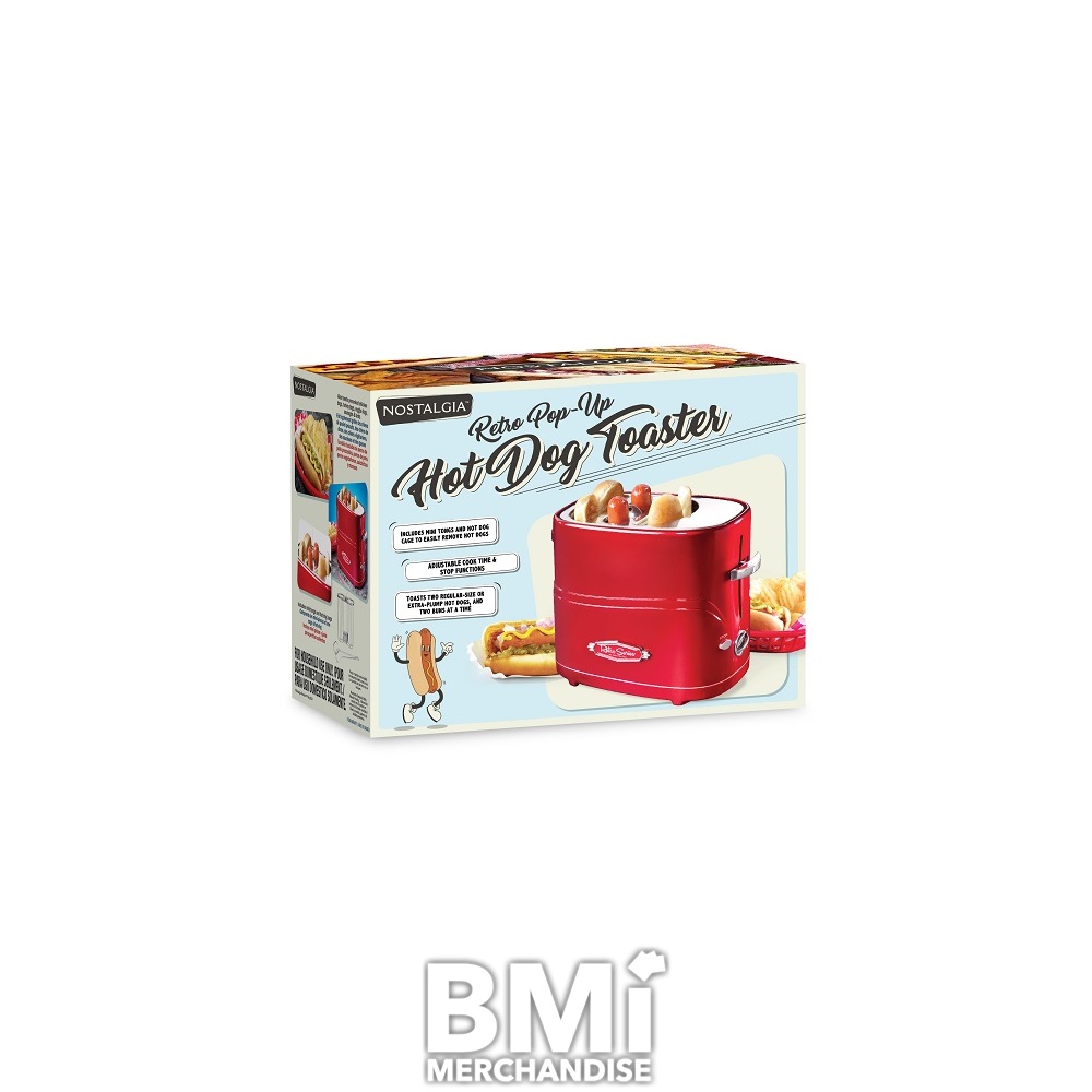 RETRO POP UP HOT DOG MAKER. QUICKLY TOAST TWO HOT DOGS AND BUNS AT THE SAME TIME. GREAT FOR ENTERTAINING AND AS A FAST MEAL SOLUTION FOR THE WHOLE FAMILY. INCLUDES MINI TONGS FOR REMOVING HOT DOGS, CRUMB CATCHER FOR EASY CLEAN UP, AND REMOVABLE HOT DOG BASKET.