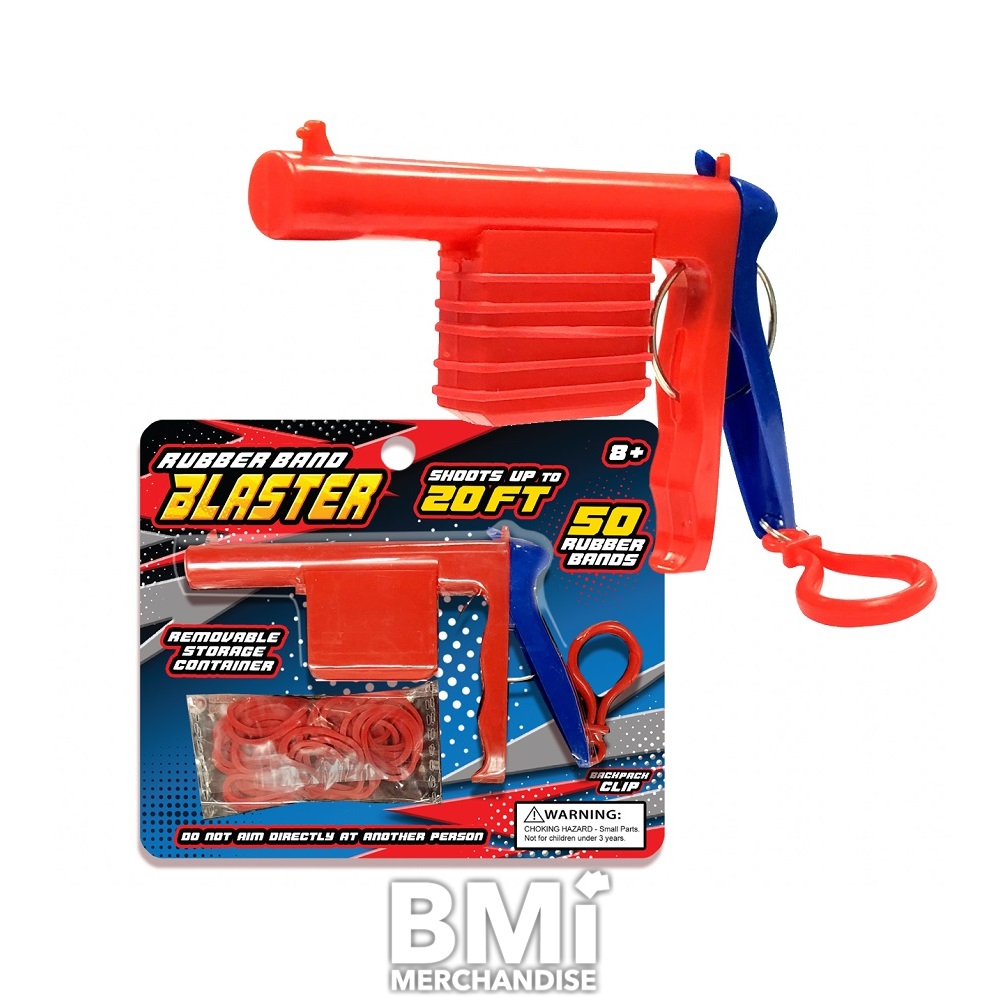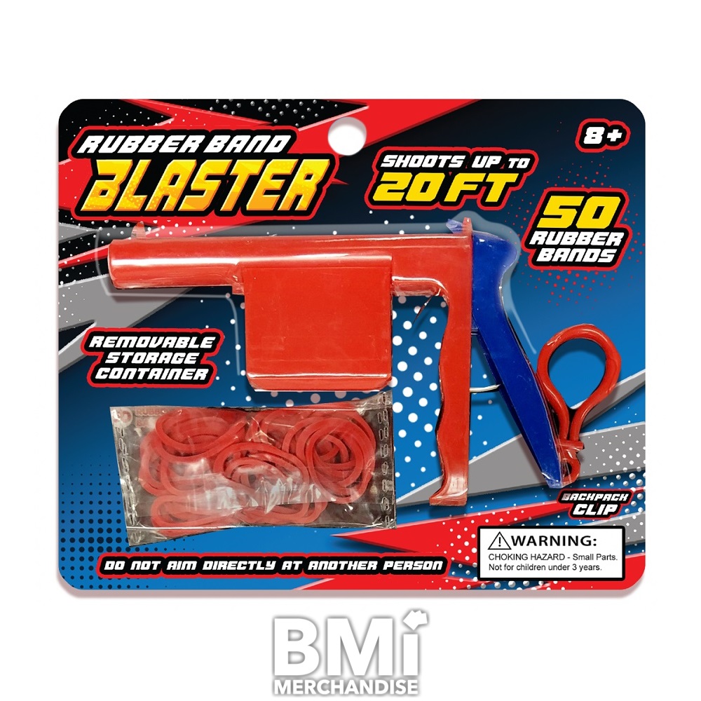 THE RUBBERBAND BLASTER SHOOTS SMALL RUBBERBANDS UP TO 20 FEET! THERE IS A CLIP ON IT SO YOU CAN TAKE IT ANYWHERE, AND SHOOTER ALSO INCLUDES A REMOVABLE STORAGE BOX TO HOLD YOUR RUBBER BANDS. INCLUDES 50 RUBBER BANDS. COMES IN ASSORTED COLORS AND YOU CAN HAVE THEM ALL!