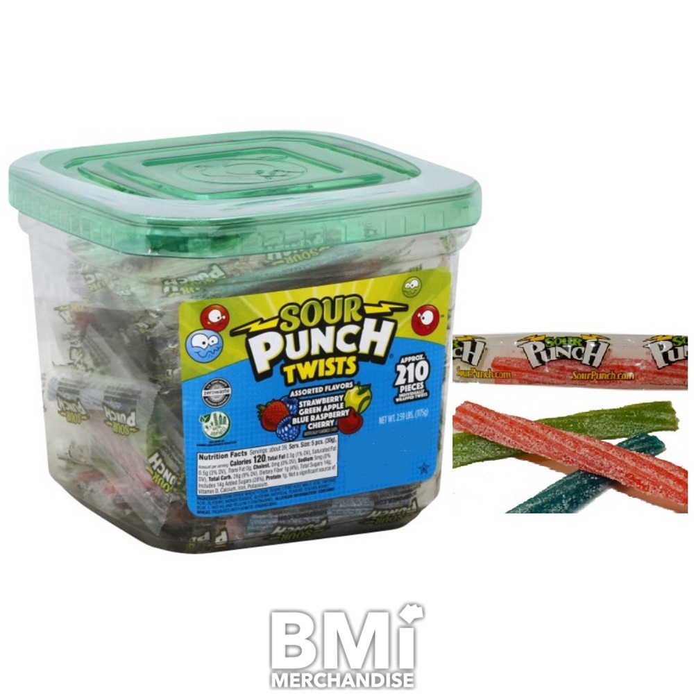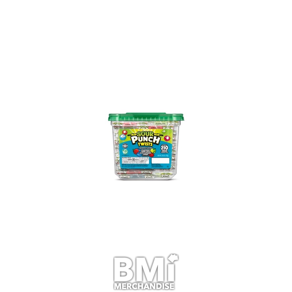 SOUR PUNCH TWISTS ARE THE PERFECT ADDITION TO YOUR CANDY CHOICES. ENJOY THE DELICIOUSLY FRUITY FLAVOR, THEN GET READY FOR YOUR LIPS TO PUCKER! 4-FLAVOR TUB INCLUDES CHERRY, WATERMELON, APPLE, AND BLUE RASPBERRY FLAVORED CANDY. A FAVORITE OF BOTH KIDS AND ADULTS, SOUR PUNCH TWISTS COME IN A TUB OF 210PCS.