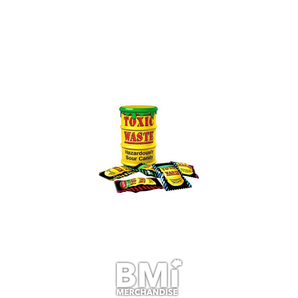 TOXIC WASTE YELLOW DRUM ASST SOUR CANDY. COLLECTIBLE CONTAINER OF OVER-FLOWING TOXIC WASTE. EACH DRUM COMES PACKED WITH ABOUT 15 PIECES OF WRAPPED CANDY, ASSORTMENT OF 5 FLAVORS. 12 DRUMS PER DISPLAY BOX