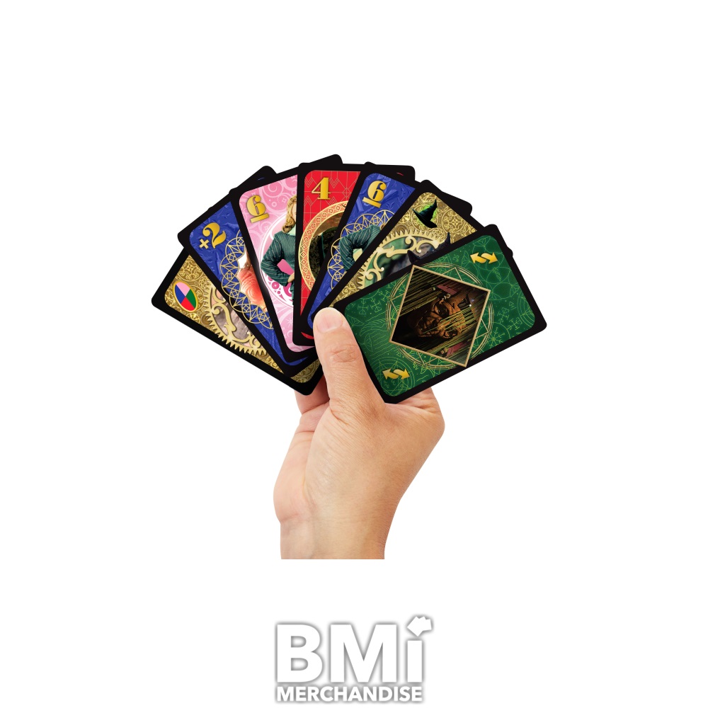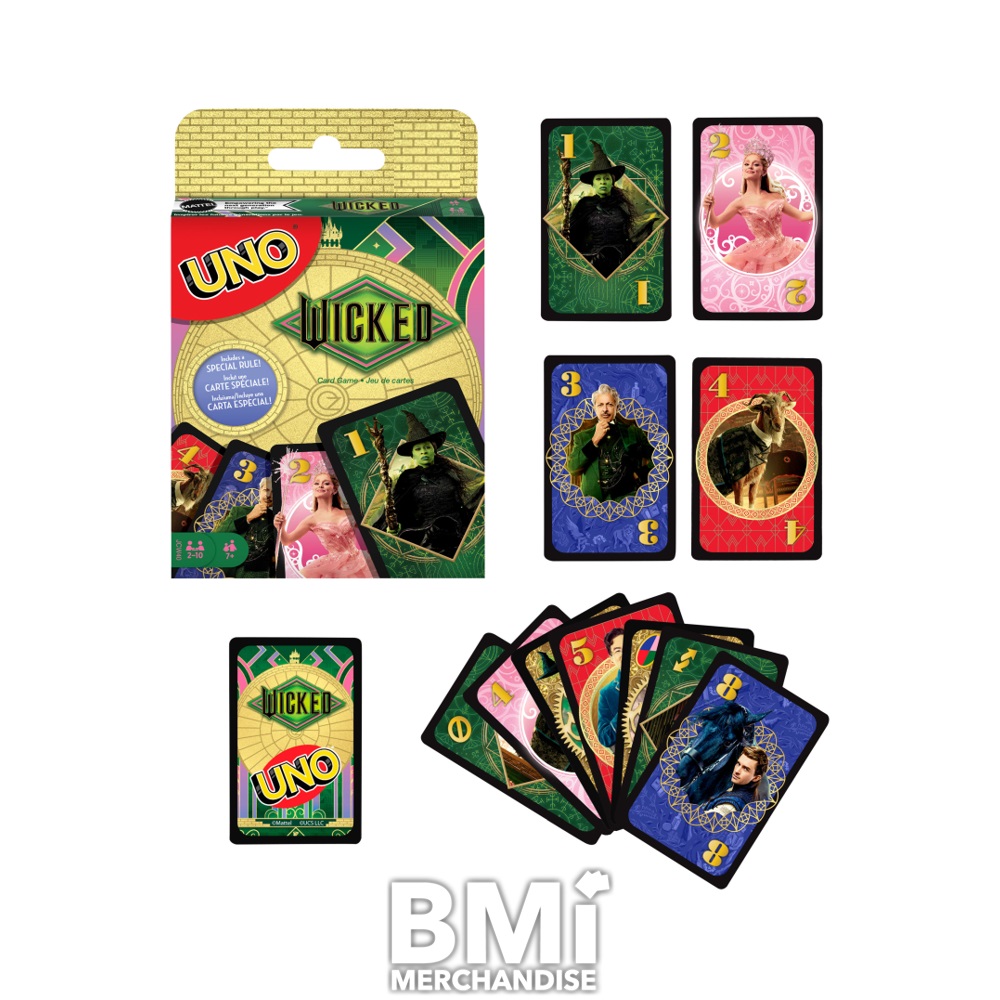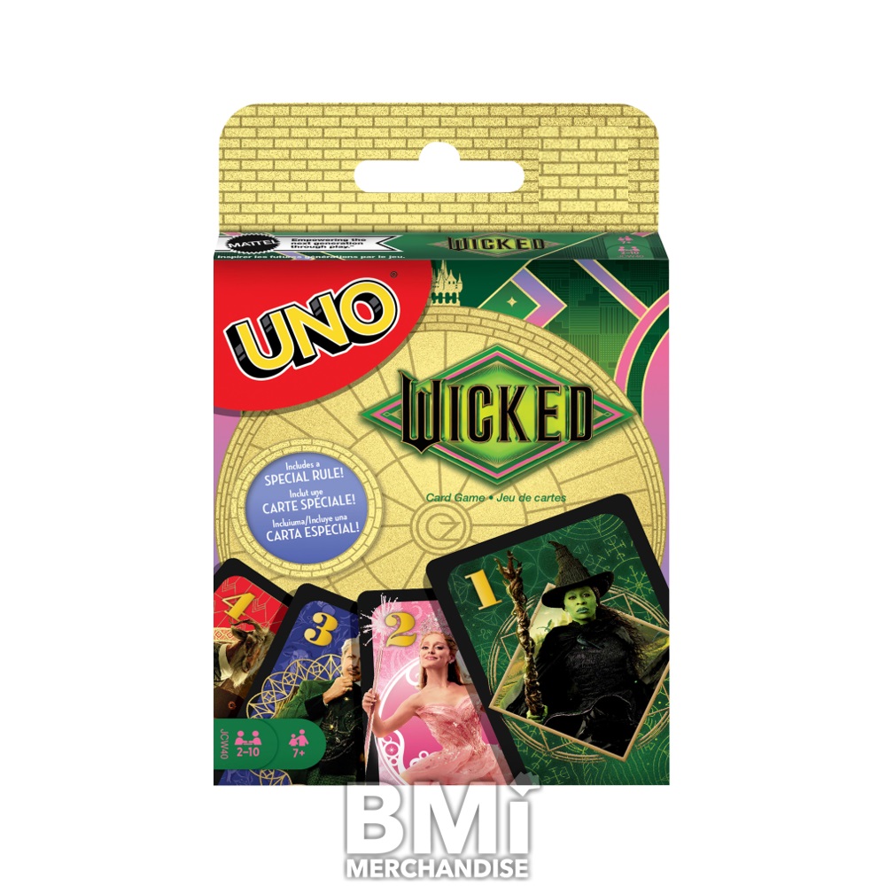FANS OF THE MOVIE WICKED WILL LOVE PLAYING THIS THEMED UNO CARD GAME! WITH A DECK FEATURING GRAPHICS INSPIRED BY FAVORITE CHARACTERS AND SCENES, PLAYERS TRY TO MATCH COLORS AND NUMBERS -- THERE’S EVEN A SPECIAL “DEFY GRAVITY” RULE THAT WILL HAVE PLAYERS FLYING (WELL, SKIPPING) BY OPPONENTS LIKE ELPHABA HERSELF! AND WHEN DOWN TO A LAST CARD, DON’T FORGET TO SING OUT “UNO!” MAKES A “POPULAR” GIFT FOR FANS OF WICKED AND CARD GAME LOVERS AGES 7 YEARS OLD AND UP. COLORS AND DECORATIONS MAY VARY.